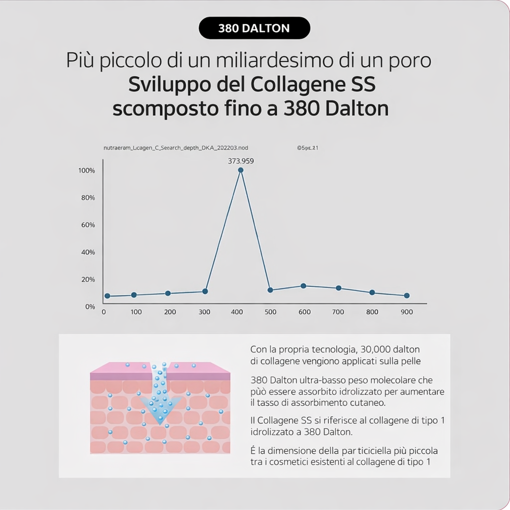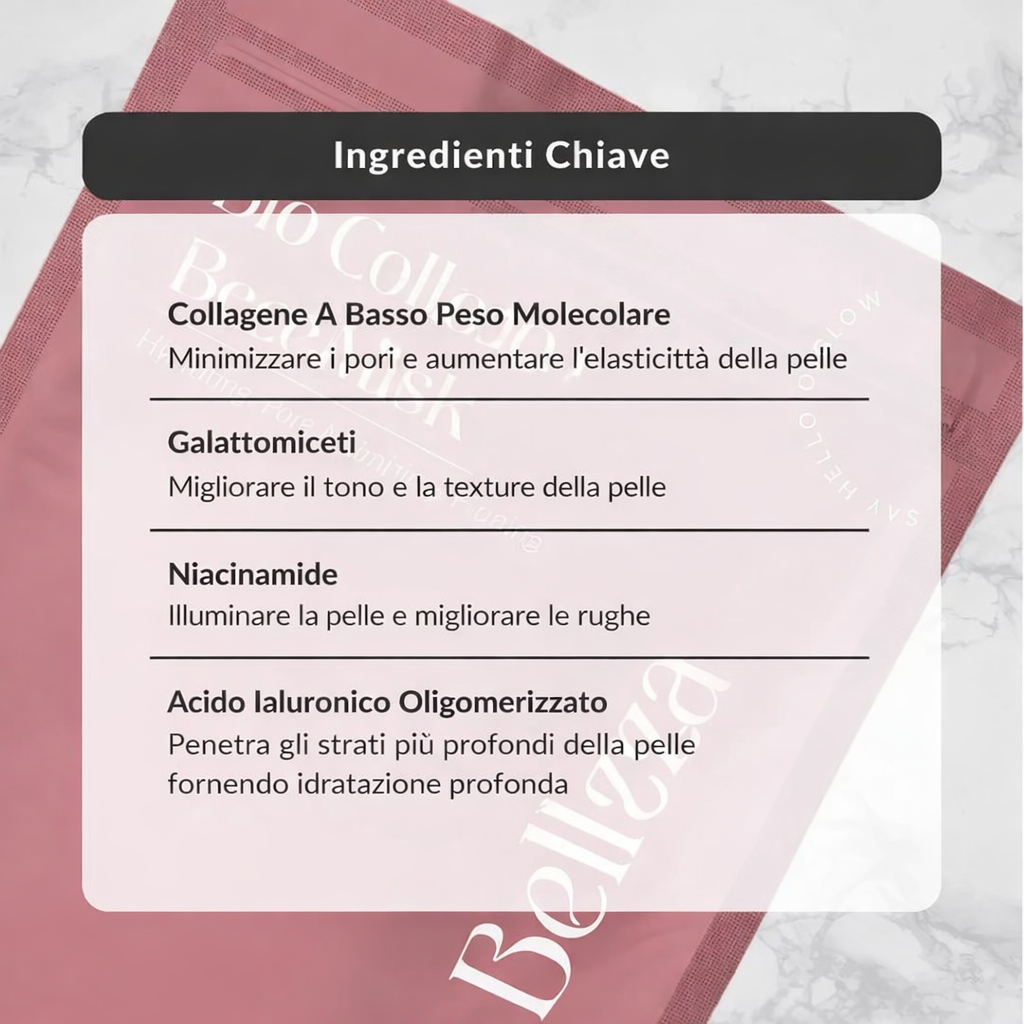 Arricchita con una potente miscela di collagene a basso peso molecolare, galattomiceti, acido oligo-ialuronico e niacinamide, la nostra maschera penetra in profondità nella struttura della pelle, affrontando i problemi alla radice. Questi ingredienti non sono semplicemente miscelati; sono selezionati sulla base di ricerche scientifiche e studi clinici all'avanguardia che garantiscono non solo risultati, ma una vera e propria trasformazione.