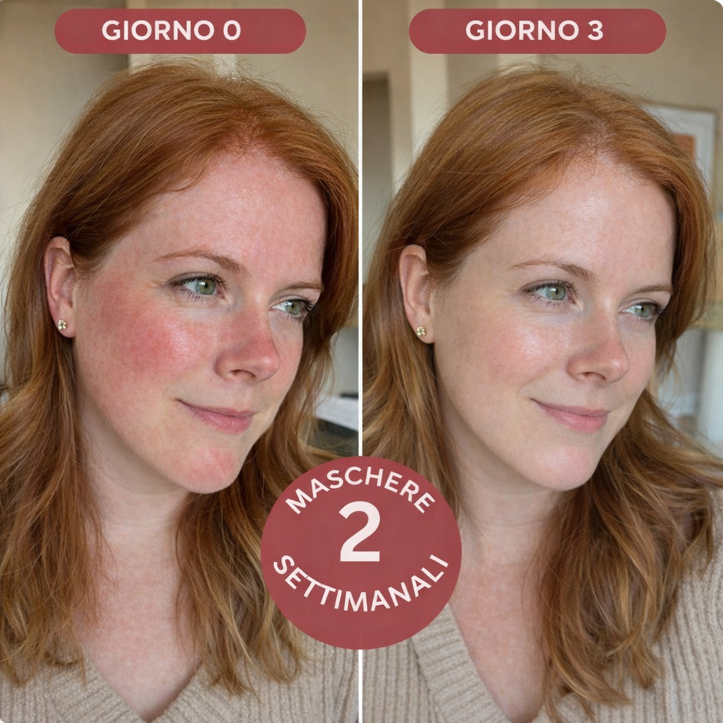Dopo soli 3 giorni di utilizzo costante, con 2 maschere a settimana, l’incarnato risulta visibilmente più equilibrato, lenito e levigato.